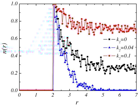 It is the gradient field of B particles that determines the self-propulsion of individual dimer as well as the pair interactions. Thus, it is essential to study its behavior under the influences of reactions in Equations (1) and (2). The forward reaction in Equation (2) requires both sufficient A and B particles while the backward reaction needs only A particles. Since Equation (1) on C sphere surface generates gradient field of B particles shown in Figure 2, the probability of forward reaction in Equation (2) is small in the region too close (bare A particles) or too far (bare B particles) from the C sphere. Thus, the forward reaction often occurs in those radial regions, e.g., around r = 3–5 in Figure 2 where profiles of radial distribution of B particles with different are plotted. To the backward reaction, it frequently appears in the bulk solution full of A particles and a little farther from C sphere. Thus, although Equation (2) is reversible, the forward and backward reactions generally take place in different radial zones. As is increased slightly, e.g., from to , the forward reaction still plays a major role and it decreases B particles. Therefore, the concentration gradient is getting steeper.