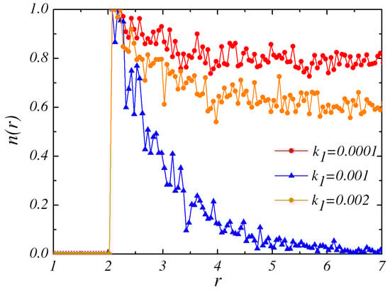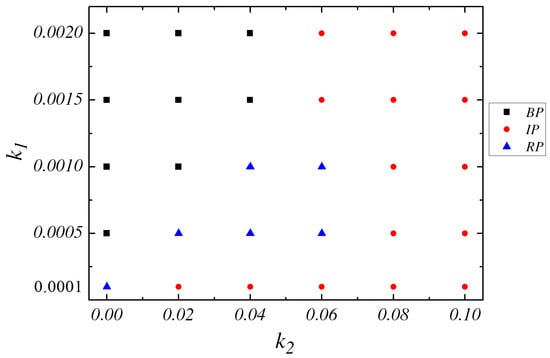 Since the two spatiotemporal reactions in Equations (1) and (2) with different response radial regions and diffusions of solvent particles, the dynamics of the system is getting very complex. If is very small, e.g., , simulation gives us the transition from RP to IP. However, if is substantially increased to , the transition from BP to IP takes place without RP state when is increased.