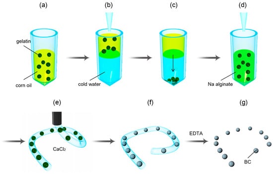 We previously proposed a new process for forming microspheres from BC [30]. This simple process excludes the use of costly materials [31]. In this study, we conducted detailed analyses of the method. As shown in Figure 1, Ca-alginate hydrogel fiber entraps the bacteria into microscopic spherical cavities. The cavities are created using the sol-gel transition of gelatin microspheres containing bacteria. The gelatin microspheres can be prepared by emulsification or microfluidics. In this study, we demonstrated the capability of microsphere preparation from BC by conducting process characterization, feature resolution, microfluidic formation of gelatin sacrificial microspheres, and comparison of the diameters of BC and gelatin microspheres.