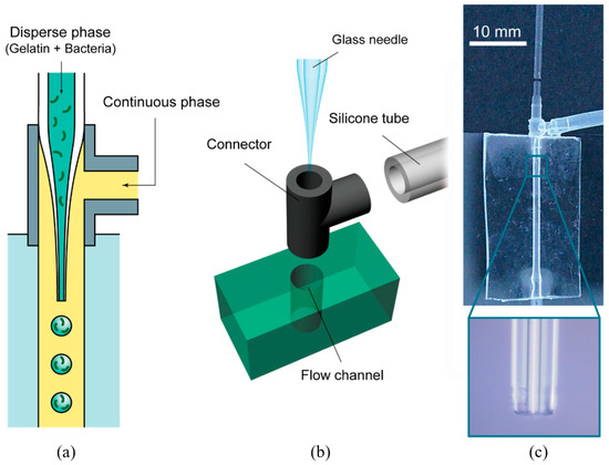 To prepare monodisperse gelatin microspheres, a co-flow microfluidic device was used (Figure 2). The microfluidic device was composed of a plastic connector (VTF 106, AS ONE, Osaka, Japan) with an inner diameter of 1.3 mm and hollow glass needle. The device design was similar to those previously reported [32,33,34]; the glass needle was formed by pulling a hollow glass tube (Hirschmann Laboratory, Eberstadt, Germany) using a Puller PC-10 (Narishige Group, Amityville, NY, USA). By introducing a gelatin solution containing K. xylinus for the continuous phase and corn oil with span 80 by syringe pumps (AS ONE), droplets were continuously generated at the tip of the glass needle. The droplets were collected in a cold corn oil bath. The mixture of gelatin and bacterial suspension was prepared by mixing the gelatin solution (100 g gelatin, 5 g polypeptone, 5 g yeast extract in 1 L deionized water) and bacterial suspension (gelatin solution: bacterial suspension = 9:1 in volume). For the continuous phase of the emulsion, corn oil containing span 80 (3 wt %) was used. The composition of the culture medium for K. xylinus was 5 g polypeptone, 5 g yeast extract, 100 g glucose, 5 g mannitol, 1 g MgSO4·7H2O, 5 mL ethanol, and 1 L deionized water.