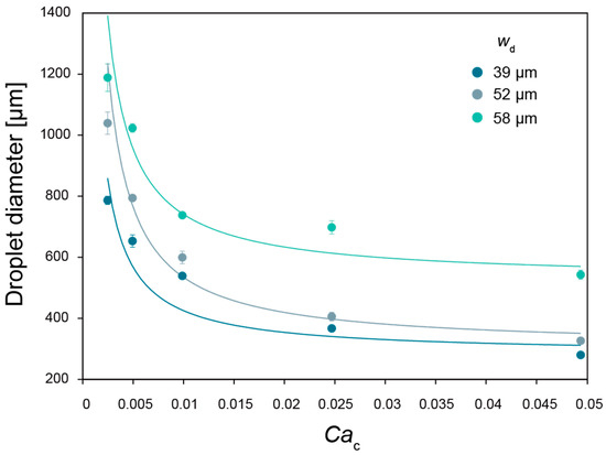 Droplet diameter versus capillary number of the outer fluid for gelatin in corn oil emulsion using the co-flow microfluidic device. Solid curve was a fit using Equation (1), where wd = 39 μm, a = 7.3, b = 0.1; wd = 52 μm, a = 5.9, b = 0.1; wd = 58 μm, a = 9.1, b = 0.1). Cac is computed using the following fluid properties: ηc = 0.075 Pa s, γ = 0.02 N/m, and wc = 1.3 mm. Error bars represent standard deviation; sample size n > 19.