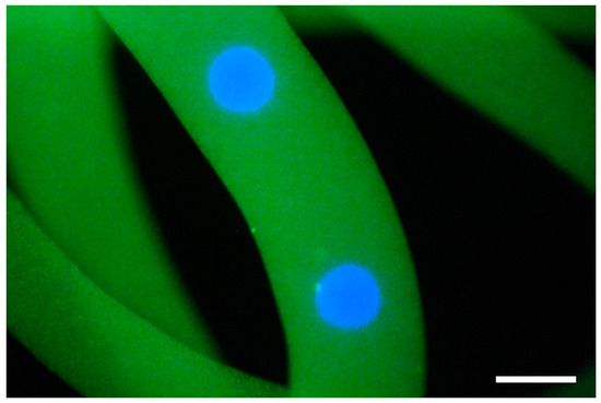 Merged fluorescent micrograph of the Ca-alginate hydrogel fiber containing gelatin microspheres colored with blue and green fluorescent particles. Scale bar, 400 μm.