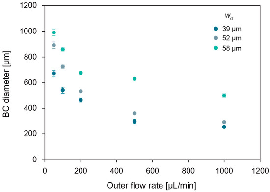 Diameters of BC microspheres using the emulsion prepared from the co-flow microfluidic device. Horizontal axis is the corresponding outer flow rate. Error bars represent the standard deviation; sample size n > 19.