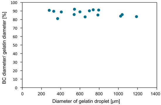 Fraction of BC microsphere diameter to gelatin microsphere diameter as a function of corresponding gelatin microsphere diameter using the microfluidic device.