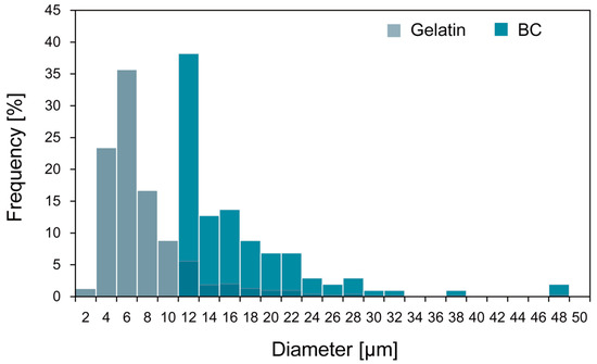Size distribution of gelatin and BC microspheres using emulsification method. Emulsification was carried out while stirring the two-phase liquids at 750 rpm.