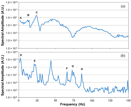 The mobility plots (based on shear force) of the APD-800 polisher, generated from a total of seven periodic hammer strikes, is shown in Figure 3a. We have chosen to truncate the x-axis at 150 Hz because the spectral amplitudes larger than 150 Hz are too low for the actual CMP processes to provide any useful information and can most likely be considered as noise [33,34,35,36,37]. Results show three major peaks, denoted as A–C: