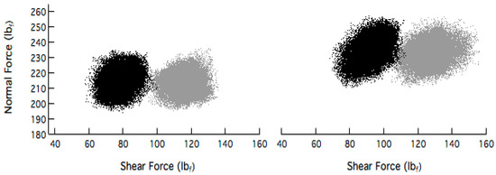 Figure 4. Shear force and normal force scatter plot for copper CMP processes resulting from Disc A (gray) and Disc B (black). The wafer polishing pressures and pad-wafer sliding velocities are 2.1 psi–1.4 m/s (left) and 2.3 psi–1.6 m/s (right).