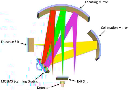 11. Kraft, M.; Kenda, A.; Frank, A.; Scherf, W.; Heberer, A.; Sandner, T.; Schenk, H.; Zimmer, F. Single-detector micro-electro-mechanical scanning grating spectrometer. Anal. Bioanal. Chem. 2006, 386, 1259–1266. [Google Scholar] [CrossRef] [PubMed]