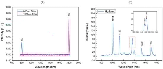 While the mechanical deflection angle reaches ±4°, the spectral scanning range can cover 800–1800 nm, as shown in Figure 4a. Since the photosensitivity of InGaAs detector varies at each wavelength, the light intensities of the 800-nm filter and the 1800-nm filter are different.