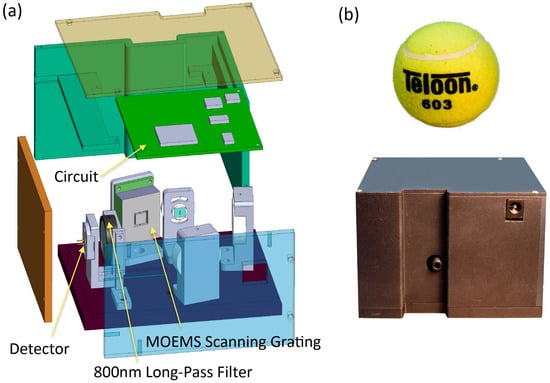Figure 6. (a) Expanded assembly drawing of the spectrometer; (b) a single-detector NIR microspectrometer encased in an aluminum housing, which is comparable in size to a tennis ball.