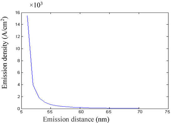 The metal field emission current can be calculated by the Fowler and Nordheim Formula (F–N) [16,17]. The simplified Fowler–Nordheim Formula is shown as Equation (1):