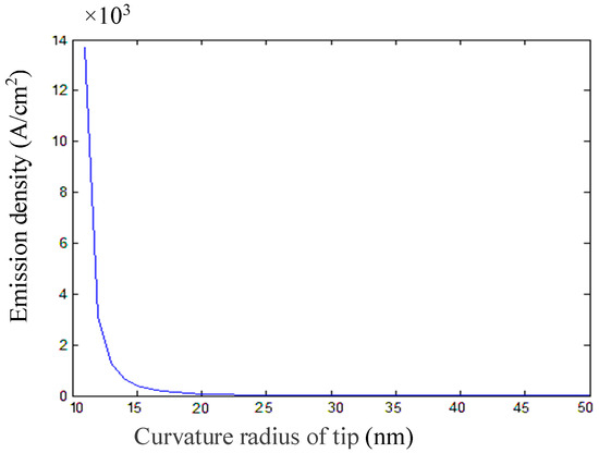 The distance between the emission current density and the cone tip radius of curvature, and the distance between the cathode cone and the anode plate, can be obtained by calculation, as shown in Figure 1 and Figure 2. Figure 1 shows that the emission current density decreases exponentially, with the distance from the tip to the anode plate being at a certain emission voltage, and Figure 2 shows that the emission current density decreases with the radius of curvature of the cone tip. In order to obtain a larger emission current at a smaller operating voltage, the radius of curvature of the tip and the distance from the tip to the anode plate should be smaller.
