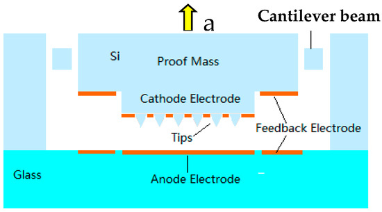 The structure of sensor consists of a proof mass with a field emission cathode tip array, a cantilever beam, an anode, and feedback electrodes, as shown in Figure 3. There are about 10,000 tip arrays on the cathode, which makes the emission current increase greatly. The external acceleration will lead to the proof mass moving, and this will cause the distance between the cathode and the anode tip array to change, causing the cathode field emission current to dramatically vary with an exponential relationship, so that the acceleration can be obtained by detecting the cathode emission current.