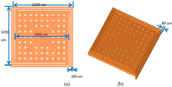 Structure of the sensitive structure of the vacuum microelectronic accelerometer. (a) Plan view of the sensitive structure; (b) 3D map view of the sensitive structure.