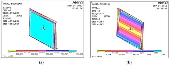The resonant frequency and modal response of the sensor were analyzed by finite element simulation (FEM); the analysis results by ANSYS are shown in Figure 5 and Table 2. Figure 4a shows the first mode in the working mode of the accelerometer; the resonant frequency was 979.08 Hz. Figure 4b shows the second mode, in which the proof mass rotates around a horizontal axis, and the resonant frequency was 1774.5 Hz. The third mode was the same as the second mode, only that the rotation axis was different, and the resonant frequency was also 1774.7 Hz, as shown in Figure 4c. Figure 4d shows the fourth mode in which the support beams vibrate, and the resonant frequency was 3069.8 Hz. The frequency of the interfering modes was far from the operating mode.