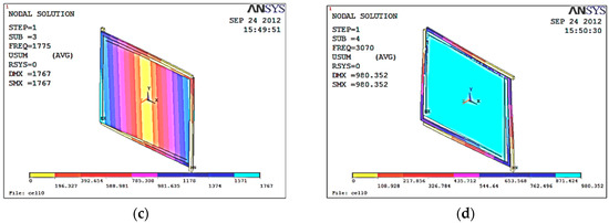 Modal graph of the vacuum microelectronic accelerometer. (a) The first mode, (b) the second mode, (c) the third mode, and (d) the fourth mode.