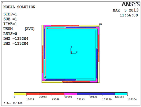 in which m is the quality of the proof mass, a is the acceleration, and x is the moving distance of the proof mass. Figure 6 shows the results of the static force analysis of the sensor; the displacement as represented by the color from the left to the right of the figure increases in turn. The simulation analysis results show that the displacement of the proof mass reached the maximum value of 0.13 μm when there was ± 1 g of acceleration along the Z axis; the quality of the proof mass was 4.72 × 10−6 kg; and the effect force applied on the proof mass was 4.72 × 10−6 N, so that the approximate elastic stiffness was 36 N/m by calculation.