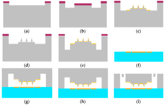The vacuum microelectronic accelerometer is based on bulk silicon MEMS technology, which is based on the double-side polished N-type (1 0 0 direction) silicon wafer, which has a high tensile strength and low mechanical losses. The process of the fabrication of a vacuum microelectronic accelerometer includes the silicon process and the glass process, as shown in Figure 7. During the wafer process, etching groove windows are made to form a bonded anchor (a); etching groove windows are made to form the cone station (b), followed by corrosion cone and sharpening (c), and cone metallization after ion implantation (d); finally, ICP etching is performed to form the beam area (e). The glass processes form the electrodes on the glass surface (f). Finally, the silicon and glass are bonded (g), and the silicon is thinned by KOH etching (h); the ICP structures are then released to form the beam (i). After all these processes, the sensitive unit of the vacuum microelectronic accelerometer is formed.