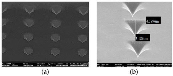 The tip shape is one of the main factors that affect the performance of the accelerometer, and the processes of the tip is also one of the key processes for the accelerometer. The silicon tip arrays are formed by wet etching with the HNA solution (HNO3, HF, and CH3COOH) and metalized by TiW/Au thin film; the morphology of the tip is an ideal pyramid, as shown in Figure 8.