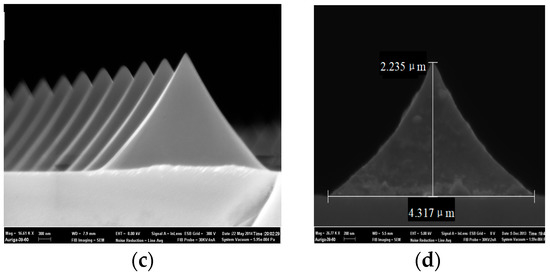 Scanning electron microscopy (SEM) of the cathode tip array. (a) Array front view, (b) partial front view, (c) array side view, and (d) partial side view.