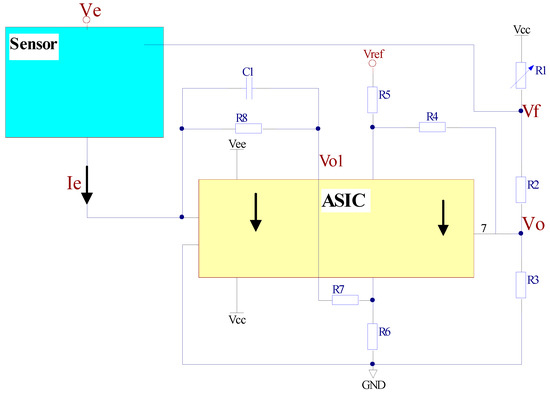 The interface circuit includes a current–voltage conversion, a differential amplifier circuit, and electrostatic force feedback circuit modules, as shown in Figure 9. The mass will produce a slight displacement under acceleration, and it will lead to changes in the emission current; after the current is converted into voltage and amplified, the voltage signal Vo associated with the displacement of the mass is obtained.