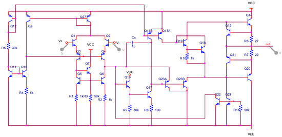 In order to improve the signal-to-noise ratio of the circuit, the two op amps, U1A and U1B in the circuit, were designed as application-specific integrated circuits (ASICs), which include an integrated dual operational amplifier. The basic structure of the interface ASIC is shown in Figure 10 and Figure 11 is the schematic circuit of the interface ASIC.