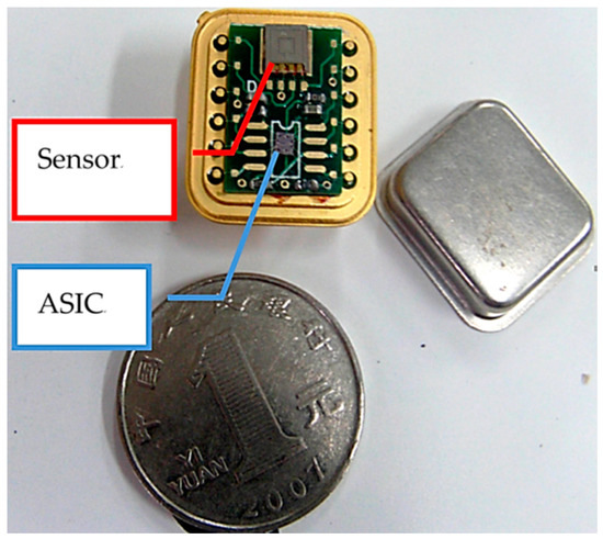 Finally, the sensitive structure unit and the interface ASIC chip were integrated on a PCB board, and the accelerometer was packed in the vacuum packaging machine, whose vacuum degree could reach 10−4 Pa; getter was added into the tube to maintain a high vacuum degree for a long time. The photo of hybrid integrated vacuum microelectronic accelerometer is shown in Figure 13. The working voltage of the accelerometer was a ±15 V power supply.