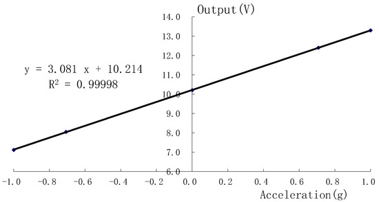 A gravitational field static rollover test was carried out in order to test the sensitivity, linearity, and zero stability, to use the mirroring precision rotary indexing head. The testing data are shown in Figure 14 and Table 4. Test results showed that the measuring range was −1 g~1 g, and that the sensitivity of the accelerometer was 3.081 V/g; the least squares fitting correlation coefficient reached 0.99998, and the non-linearity was 0.84%.