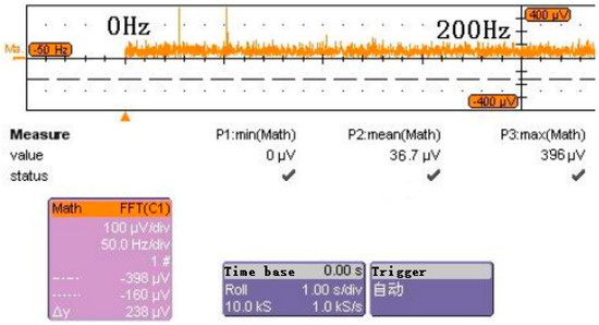 Figure 15 shows the spectrum density of output signal, in which the x-axis is the frequency and the y axis is the peak-to-peak spectrum density (μV/), and the average noise spectrum density value is 36.7 μV/ in the frequency range of 0–200 Hz. Because the output sensitivity of the accelerometer is 3.081 V/g, the resolution of the vacuum microelectronic accelerometer can reach 1.1 × 10−5 g.