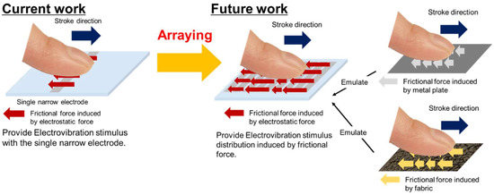 Electrovibration tactile displays stimulate mechanically the contacting skin by modulating the frictional force and have a simple structure, since only an insulator layer and an electrode are required for the stimulation. The principle of electrovibration tactile displays was accidently discovered by Mallinkrodt in 1952 [19]. Electrovibration tactile displays have been studied for several decades [20,21,22,23]. For example, Bau et al. integrated an electrovibration tactile display into a touch screen display and developed an information device [24]. Vardar et al. evaluated the fundamental characteristics of an electrovibration tactile display, such as the relationship between the frequency and perception [25]. Jiao et al. optimized the signals to an electrovibration tactile display to provide more realistic tactile sensation [26]. The electrovibration tactile displays mentioned above consist of a single electrode. Therefore, constant vibration is provided to the contacting skin. When a human touches the surface of an object, the contacting part of the fingertip deforms spatially [27,28]. Additionally, the textures of day-to-day surfaces are fine [29]. For example, wood surface has bumps with a pitch of a few micrometers. Therefore, the high-resolution electrode for electrovibration stimulus, which results in spatial and detail control of frictional force, has a possibility to emulate the textures of the day-to-day surfaces, as shown in the right side of Figure 1. The multi-electrode electrovibration tactile display consists of narrow electrodes, and the voltage to each electrode is controlled separately. The multi-electrode electrovibration tactile display can be easily applied to the existing applications, including the touch screen display [24], and has a possibility to provide more realistic tactile sensations than existing electrovibration tactile displays through applications.