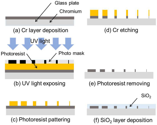 Fabrication process of the array of the electrodes. (a) Cr layer deposition. (b) UV light exposure. (c) Photoresist patterning. (d) Cr etching. (e) Photoresist removing. (f) SiO2 layer deposition.