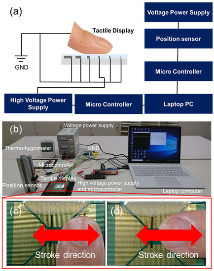Figure 5a shows the schematic illustration of the experimental setup. The experimental setup consisted of a laptop computer (Surface Pro, Microsoft Corp., Redmond, WA, USA), microcontrollers (mbed LPC 1768, ARM Ltd, Cambridge, UK), a fabricated tactile display, a high voltage power supply (MHV12-1.0k, Bellnix Co., Ltd, Saitama, Japan), a position sensor (GP2Y0A21YK, Sharp Corp., Osaka, Japan) and a power supply for the position sensor (PR18-1.2A, TEXIO Technology Corp., Kanagawa, Japan). The image of the experimental setup is shown in Figure 5b. A thermo-hygrometer (O-230, dretec Corp., Saitama, Japan) was placed to measure temperature and humidity. The value of the applied voltage was adjusted with an evaluation system on the laptop computer and the control signal was sent to the high voltage power supply through the microcontroller, which was used as a D/A converter. The applied voltage to each electrode was a pulse wave. The duty ratio of the applied voltage was 10% to avoid breakdown of the insulator layer [30]. It was possible to vary the peak voltage from 0 V to 600 V with the scroll bar of the evaluation system. The frequency of the applied voltage was selected using the evaluation system. The position of the fingertip was measured with a position sensor and sent to the laptop computer through the microcontroller, which was used as an A/D converter. The stroke speed was calculated with the measured position and displayed on the laptop computer. Before the experiment, the subjects cleaned their hands with soap. The temperature and humidity of the room were observed by the thermo-hygrometer and controlled by an air conditioner. The average room temperature was 21.2 °C and the average humidity was 45.1%.