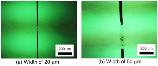 Images of the damaged electrodes. (a) The electrode with a width of 20 μm. (b) The electrode with a width of 50 μm.