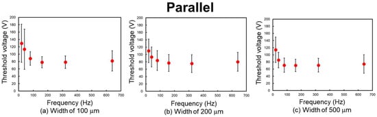 Relationship between frequency and threshold voltage. The finger was positioned parallel to the length of the electrodes, as shown in Figure 5c. (a) Width of 100 μm. (b) Width of 200 μm. (c) Width of 500 μm.