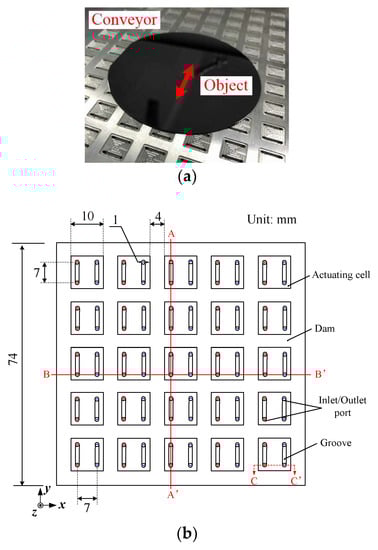 Figure 1a shows a photograph of the air conveyor. A flat object is levitated by the formed air film, and can be moved and positioned using controlled airflow in the gap. The air conveyor employs duplicated arrays of actuating cells. To facilitate analysis and experiments, as shown in Figure 1b, a representative unit is focused. The unit is a 74 mm square consisting of 25 actuating cells. Each cell is actually a 10 mm square pocket (depth: 150 μm) surrounded by a dam with a width of 4 mm. In the pocket, two pairs of inlet/outlet ports (φ = 1 in diameter) are opened. The two inlet ports are connected with a groove, which has a dimension of 1 mm width and 1 mm depth, and similarly, the two outlet ports are also connected with a groove. We consider that these grooves can stabilize the flow in the pocket. In this study, we aim to achieve one dimensional transport and positioning. Accordingly, all the inlet/outlet ports located in the same column are connected with an internal perforation which is then connected to an independent fast switching valve (3/2 normally opened valve). By this means, each column can be selected for positive pressure or negative pressure by switching the valves as required.