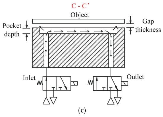 The working principle is illustrated in Figure 1c. The inlet ports are connected to positive pressure while the outlet ports are connected to negative pressure. Therefore, a horizontal airflow is formed in the pocket due to the pressure difference that accordingly generates a viscous force, namely, the shear stress at the boundary. Meanwhile, the entering air forms a supporting film underneath the object. Because of the supporting function and the actuating function, the object can be transported without mechanical contact.