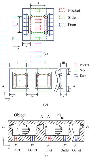 Figure 2a shows a typical actuating cell consisting of three areas. They are the pocket area, dam area, and side area. The airflow in the pocket area and the side area is assumed along the x-direction, and the airflow in the dam area is the opposite. The film thickness for the dam area and the pocket area is denoted as d and h, respectively. Here, d is the distance from the lower surface of the floating object to the upper surface of the air conveyor, while h is the distance from the lower surface of the floating object to the surface of the pocket (refer to Figure 2c).