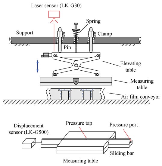 Since pressure distribution is very sensitive to inclination of the gap, the measuring table must be strictly parallel with the test device and the gap thickness should be finely adjusted. An experimental apparatus is proposed to accomplish this, as schematically shown in Figure 3. A measuring table with a sliding bar which has a small tap hole and an internal connecting perforation was used to measure the film pressure. First, the measuring table was installed at the bottom of an elevating table. Then, the measuring table was fixed by the following steps: (1) The measuring table was placed inversely on the conveyor surface and then set down three pins to make sure that their tips touched the top of the elevating table. (2) The pin clamps we turned until the pins were held tightly, and then we used a spring to fix the elevating table to the support. The vertical position of the measuring table is adjustable and can be read through a laser displacement sensor (LK-G30, Keyence Co., Ltd., Osaka, Japan, resolution: 0.1 μm). Another displacement sensor was used to measure the position of the sliding bar. A pressure sensor (KL17, Nagano Keiki Co., Ltd., Tokyo, Japan) with a range of 0–2 kPa was connected to the pressure tap through the internal perforation. In this way, the pressure distribution can be measured by recording the film pressure and position while slowly moving the sliding bar.
