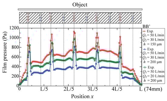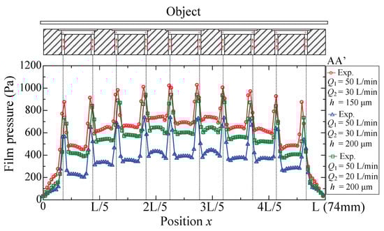 Experiments were performed with supply flow rate Q1 = 50 L/min (ANR), suction flow rate Q2 = 20 and 30 L/min (ANR), and gap thickness h = 150 and 200 μm, respectively. Figure 4 shows the film pressure distribution on line AA’ (cf. Figure 1b), which is perpendicular to the direction of airflow in the pockets. In each pocket, there are two high pressure peaks concentrated around the center of the inlet ports. The film pressure is distributed symmetrically with respect to the centerline, and a uniform distribution is recognizable in the grooves. The amplitude of the pressure is influenced by the suction flow rate and the gap thickness. Contrast experiments were performed to clarify their effects. When the gap is narrowed, the pressure distribution shifts upward but maintains a nearly unchanged shape. This is because the viscous impedance of the gap is determined by the clearance. The narrower the clearance, the larger the viscous impedance; hence, the entire film pressure increases as the gap impedance is enlarged. If the suction flow rate, Q2, is enlarged, the amount of air that escapes into the dam area would reduce and thus lead to decreased pressure distribution. The symmetrical pressure distribution indicates that the viscous force generated in the width direction is considerably small and therefore can be neglected.
