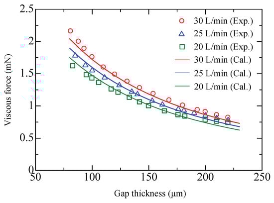 Measuring the viscous force is important since it is an effective way to evaluate the accuracy of the mathematical model. The research group of TU Delft [] reported a well-designed experimental apparatus which ensures adequate measuring accuracy of viscous force in the order of 10−3 N. In this work, the experimental apparatus is designed in a similar way as schematically shown in Figure 6. A flat plate is supported upon the conveyor surface by a pressurized air film. A force sensor (LVS-5GA, Kyowa Electronic Instruments, Tokyo, Japan) is installed on a sliding track, and its mounting head contacts with the lateral side of the plate to measure viscous force. The force sensor was calibrated and a preamplifier was used. The position of the sliding track can be finely adjusted using the micrometers. The air conveyor unit is placed on a stationary table, which is mounted on a slight tilt by adjusting three adjustable screws. Thus, the mounting head of the force sensor is in contact with the plate, and viscous force measurement can be obtained by subtracting the component of gravity of the plate. Moreover, the film thickness can be varied by slowly changing the mass of the floating object and detected using a laser displacement sensor (LK-G30, Keyence Co., Ltd., Osaka, Japan, resolution: 0.1 μm).