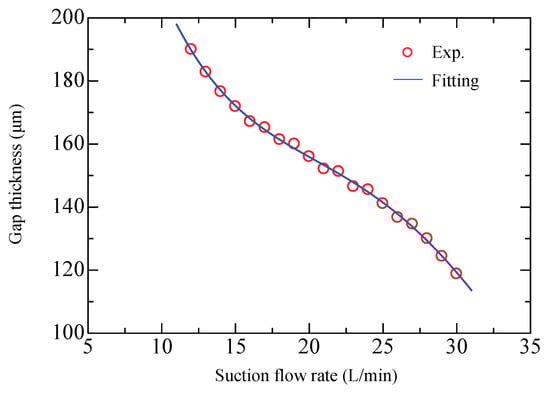 The theoretical deduction of the equations above is greatly inspired by works in the literature [,,,]. When applying the equations to calculate the viscous force, there is a problem that the effective flow rate through the gap is necessary for calculating the pressure difference p1-p2. We thus made an extension to the modeling to accommodate for this in the present study. A fitting equation (Equation 16) is proposed to approximate the effective flow rate through the gap including the effect from the inlet/outlet flow and the gap thickness. The fitting coefficients are determined experimentally. This treatment improves the modeling and is especially appropriate for the present study since the position control of the object is implemented by varying the suction flow rate (detailed in Section 5.2).