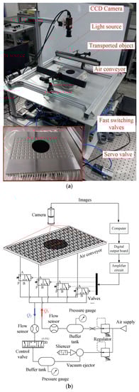 Figure 11a shows the photograph of the experimental apparatus for position control of a planar object. The air conveyor is a 228 mm × 204 mm rectangle consisting of 128 actuating cells. The upper surface was carefully leveled by turning the supporting screws. A charge-coupled device (CCD) Camera (Manta G-031B, Allied Vision, Stadtroda, Germany) was placed above the conveyor to obtain the position of the object. Light sources were installed to improve the accuracy of the vision detection. Figure 11b shows the air supply circuit, which includes a pressurized air branch and a vacuum branch. The vacuum branch was created using a vacuum generator (vacuum ejector or vacuum pump). Two buffer tanks were placed to stabilize the supplied positive pressure and the negative pressure, respectively. For 1D-position control, the inlet/outlet ports that share a column are interconnected and can be selected for the air circuit or the vacuum circuit using a 3/2 fast switching valve (MHA3-M1H-3/2G-3-K, Festo Co., Ltd., Esslingen, Germany); a total of 32 valves are in use. Ports P, A, and B of the valve are connected with positive pressure and inlet/outlet ports of the air conveyor are connected with negative pressure. Two thermal-type flow sensors were used to indicate the steady flow rate in the air circuit and vacuum circuit, respectively. A proportional directional control valve (abbreviated as “control valve” in the following) was connected in the vacuum circuit to adjust the suction flow rate. During the experiments, the supply pressure was regulated to 500 kPa, and a choked flow rate of 100 L/min was produced using an orifice. In this case, the pressure in the buffer tank was approximately 10 kPa. For the vacuum branch, the supply pressure was −20 kPa. A software package was developed on the computer using VC++ (Microsoft, Redmond, WA, USA) to receive and process the images transmitted from the camera. Electrical control signals were sent by computer via multichannel digital output boards with a 5 V/24 V amplifier circuit.