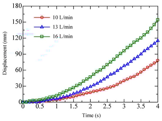 In this work, the direction and the amplitude of the actuating force are separately controlled. The actuating direction can be selected by opening and closing the appropriate valves. Figure 12 shows three different cases. The small filled black circle represents that the port is selected for negative pressure while the empty circle for positive pressure. For cases 1 and 2, the arrow denotes the direction of the generated force. For case 3, all of the ports are supplied with positive pressure and therefore there is no actuating force generated. Within the covered area, the ports are selected for the control pressure by switching the fast switching valves. However, for the uncovered area, all of the ports are connected with positive pressure but no pressurized air film can be formed. The aforementioned analysis on the viscous force implies that the amplitude of the actuating force can be adjusted by varying the suction flow rate. To verify this, open loop control experiments were performed to compare the movements of the object with different suction flow rates. The test object is a circular plate (diameter: φ = 80, weight: 16.9 g), which covers five columns of actuating cells. The supply flow rate is set to 100 L/min, and the suction flow rate is set to 10, 13, and 16 L/min, respectively. Figure 13 shows the measured results in the form of displacement versus time. Evidently, the object exhibits a larger velocity as the suction flow rate increases, and the velocity at 4 s is approximately 37.5 mm/s, 51.6 mm/s, and 80.1 mm/s. As a result, we can accelerate, decelerate, and reverse the movement by adjusting the actuating force and the direction.