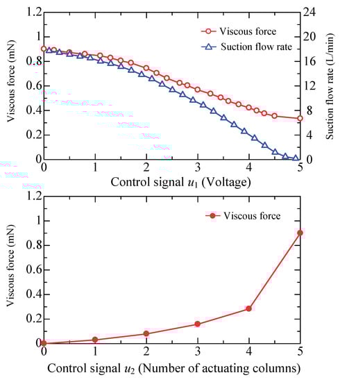Two control methods are introduced above: (1) selecting the number of actuating columns by fast switching valves (abbreviated as “method 2” in the following). In this method, both the actuating direction and amplitude of the viscous force can be controlled only with the fast switching valves; (2) adding an extra control valve to adjust the suction flow rate (abbreviated as “method 1” in the following). In this method, a servo valve is connected to the vacuum branch to adjust the suction flow rate thereby changing the amplitude of the viscous force while the actuating direction is controlled using the fast switching valves. An example is raised here for a more clear explanation for the control signals. For method 1, u1 = 1 means that an analog voltage of 1 V is sent to the control valve. For method 2, u2 = 1 means that only the leftmost column of cells is used as the active actuating column (refer to Figure 14).