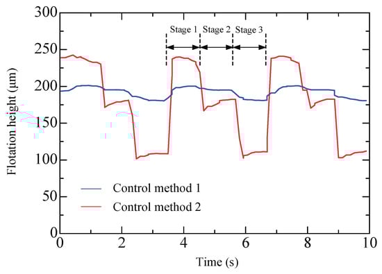 We thus conduct experiments to compare the two control methods. A circular plate (diameter: φ = 80, weight: 10.4 g) is floated on the air conveyor, and a smooth wall is set to prevent it from slipping away. The control signals are sent and the fluctuations of the floating object are recorded. For method 2, the control signals (5, 4, and 3) are sent by turns and held for a while (5, 4, and 3 for stages 1, 2, and 3, respectively), while for method 1, an analog voltage corresponding to the actuating force, which are roughly the same as that of the method 2, are sent. Figure 16 shows the experimental results. When the control signal is switched, the flotation height for method 2 exhibits an exaggerative fluctuation over 100 μm, which is induced by the sudden flow. But for method 1 it is only 20 μm. In the case that an object is being transported, the fast switching valves need to be frequently switched in order to vary the viscous force. Because the moving object does not contact the device, it is very likely to slip way when subjected to large disturbances. From this perspective, we believe that method 1 is comparatively superior and it is employed in the current work.