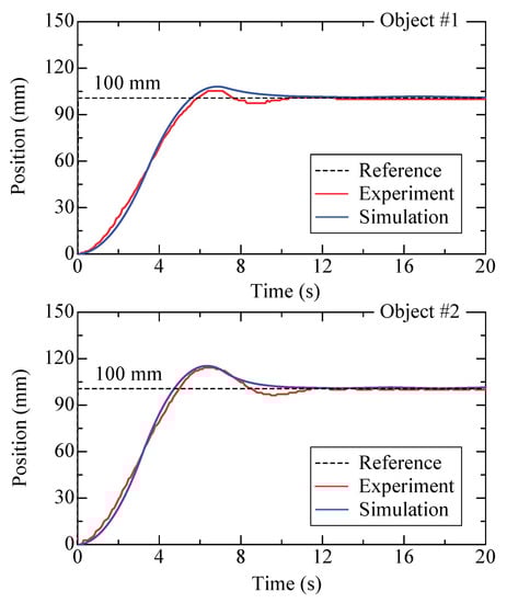 Experimental control has been made with two planar objects and the designed PID controller. The two objects have a diameter of 80 mm and a weight of 16.9 g and 10.4 g, designated as #1 and #2, respectively. During the experiments, the initial rest position of the object is set at 0 and the desired position is set as 100 mm. Results are shown in Figure 17 and the performances are summarized in Table 1. The rise time is almost the same for the two objects (3.7 s and 3.6 s). The overshoot for the heavy object exhibits a bigger value (13.3%) than that of the light object (7.3%). The static error is commonly over 0.3 mm due to the limited resolution of the used camera, and if an advanced camera is in use it can be improved. Simulated results are provided in comparison with the experimental results. In the simulation, dynamic characteristics of the valve are neglected because its response is much faster than that of the system. Furthermore, the relation of the floating height against the suction flow rate for the test object was experimentally measured and has been included. However, flow perturbation, which occurs at the opening and closing of the valves, has not been taken into account. This, to a certain extent, causes a difference between the simulations and the experimental results. Nevertheless, observation shows that the simulated curve is in accordance with the experimental data, and this verifies the effectiveness of the theoretical modeling and control method. The PID parameters slightly change with different objects because the controller is not adequately robust. Note that the use of steps as reference signals allows for the understanding of performances in the most unfavorable case. Taking a smooth reference signal would obtain a better result. It should be noted that there are some limitations for the size of the transported object. In theory, transport of large glass substrates with areas of approximately 2–3 m2 is feasible if the designed air conveyor is adequately large. However, the current air conveyor has an effective area of 228 × 110 mm2 (16 × 8 square pockets distributed in arrays), and therefore, for a circular plate, the maximum diameter should be less than 110 mm. Meanwhile, the minimum size for the plate should ensure the coverage of four complete pockets for stable movements. Therefore, the minimum diameter should be larger than 34 mm. In addition, the weight of the object produces a noticeable effect on the floatation height and thereby affects the actuating force. In this work, for a φ = 50 mm plate, transport is difficult to realize if the object’s weight is less than 5 g.