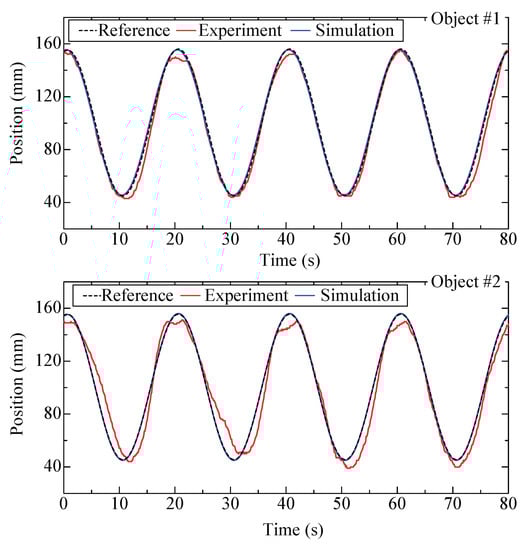 Figure 18 shows the tracking results. The reference signal is a sine signal with a period of 20 s and amplitude of 55 mm. The results show that good tracking is realized but large deviations unexpectedly appear. This is because the object is transported without any mechanical contact and even tiny disturbance might exert influences on the tracking results. Theoretically, a tracking frequency of 0.1 Hz is viable; however, it is difficult to experimentally actualize due to unavoidable disturbances. These results are compared with those of a previous work [,]. For the step response, the overshoot is negligibly small in the previous work but considerably large in the current work. This is due to differences in the experimental apparatus. In the previous work, a smooth wall that touches the edge of the object is set in order to make the object move along a straight line, and thus friction exists. The maximum velocity was 5.2 mm/s and the maximum acceleration was 1.6 mm/s2. However, in the current work, the geometry of the air conveyor and the control method have been optimized and such a block is not required. Overshoot easily occurs in the absence of friction, but the maximum velocity was increased to 17.2 mm/s, while the maximum acceleration increased to 5.4 mm/s2. In addition, the relative error evaluated by the root-sum-square method was approximately11.5% for the previous work and 3.2% for the current work. From the comparisons, we conclude that the method with suction flow rate as the control variable, rather than the number of actuating columns, is superior because it can reduce the disturbance induced by the opening and closing of the valves, and thus the object moves more smoothly. Better results are expected if disturbances can be further reduced, and this will be a part of future works.