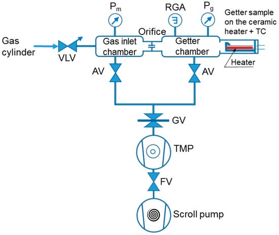 For characterizing the activation effect on the getter gas sorption behavior and for evaluating the getter sorption property performances, a getter test system was used (Figure 1). This experimental system was designed based on the standard ASTM-F798 method [18] for the evaluation of gas sorption characteristics. The system consisted of two communicating chambers (getter chamber and gas inlet chamber), through a conductance orifice. These chambers could be simultaneously evacuated or isolated by actuating manually the vacuum valves (AV; EV-150, Huntington Mechanical Labs, Inc., Grass Valley, CA, USA and GV; E-GV-2500M, MDC Vacuum Products, LLC, Hayward, CA, USA) located on the bypass passages connected to the pumping units (Turbo-molecular pump (TMP) and Scroll pump). The getter chamber was made in a cylindrical tube form (diameter = 35 mm and length = 150 mm) from stainless steel, as the rest of all vacuum system parts, and the measured getter sample installed inside was of a rectangular shape with gettering surface area dimensions of 2 cm × 6 cm. The pressure in each chamber was measured using a pressure gauge (Pg, Pm) Bayard Alpert type hot cathode ion gauges (PBR 260, Pfeiffer Vacuum, Asslar, Germany). Nitrogen (N2) gas was admitted in the inlet chamber via a UHV high-precision variable leak valve (VLV; ULV–150, MDC Vacuum Products, LLC). The total system was evacuated by a 60 L/s TMP (TMU 071P, Pfeiffer Vacuum) in series with an oil-free dry scroll vacuum pump (ISP–90 Scroll Meister, Anest Iwata, Inc., Cincinnati, OH, USA). The ceramic heater was made from an alumina plate with a smooth surface finish with a resistance heating element of 50 Ω at RT; it could reach a maximum temperature of 500 °C (CMTECH; Daegu, Korea). A K–type thermocouple (TC) inside the getter chamber and in contact with the heater was used for measuring the temperature of the getter. Regarding the residual gas analyzer (RGA) element, figuring on the getter test system schematic diagram, it is worth to mention that this device was not installed on the system in the experiments for measuring the effective total pressure in the chambers. Such action was considered in order to avoid any parasitic effect on the measured pressures, leading to ambiguous results and difficulties in interpretations.