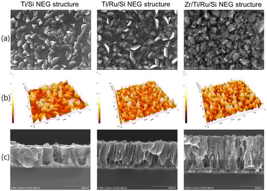 SEM surface micrographs (a), 3–D AFM images (b), and SEM fracture cross-section micrographs (c) of single Ti/Si NEG (left column); multilayer Ti/Ru/Si NEG (middle column) and multilayer Zr/Ti/Ru/Si NEG (right column).