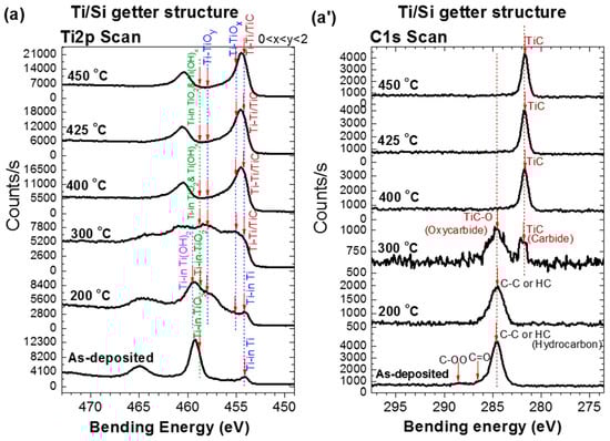 Evolution of XPS spectra after activation at various temperatures. (a,a’) Ti 2p and C 1s orbitals for the single layer Ti/Si NEG; (b,b’) Ti 2p and C 1s orbitals for the multilayer Ti/Ru/Si NEG; (c,c’) Zr 3d and C 1s orbitals for the multilayer Zr/Ti/Ru/Si NEG.